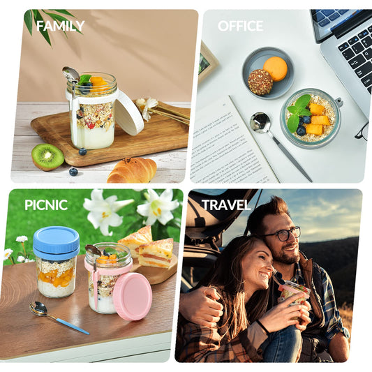 DRKIO 4 Pack Overnight Oats Containers with Lids and Spoons 16 Oz Glass Mason Jars for Overnight Oats Leak Proof Oatmeal Container Great for Cereal Fruit Vegetable Milk Salad Yogurt Meal Prep