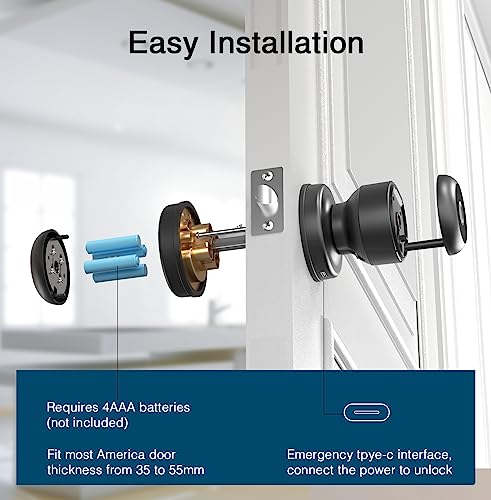 GHome Smart Door Knob Fingerprint Door Lock, Biometric Smart Lock for Bedroom Door, App Control, Emergency Type-C Charging, Great for Home, Offices, Hotels, Apartments, Garages, Matte Black
